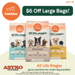 From April 1st to April 30th, enjoy $6 off all large bags of Canidae pet food. Stock up on high-quality nutrition for your pets while saving on your purchase for a limited time only!