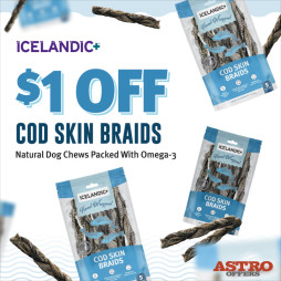 Save $1 on Icelandic Cod Skin Braids. Treat your pet to a tasty, healthy chew while enjoying this limited-time savings!